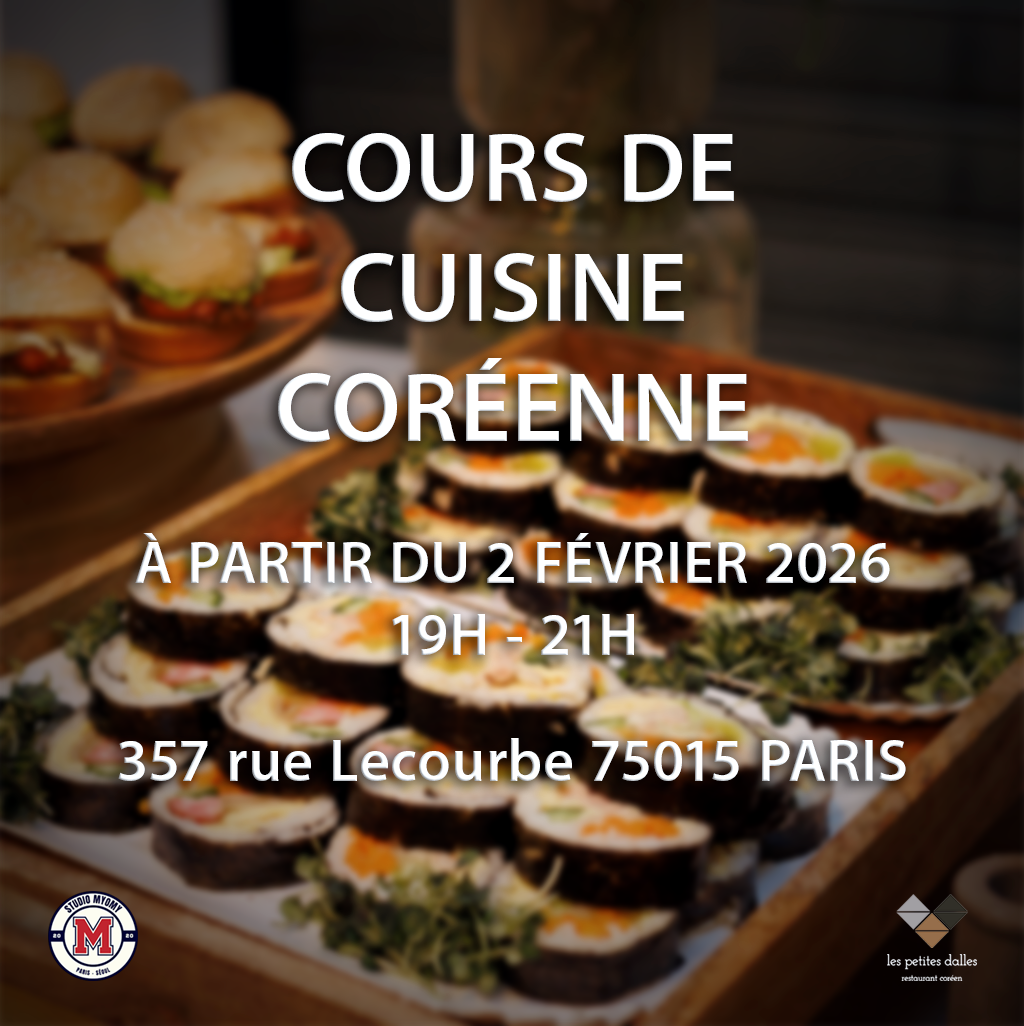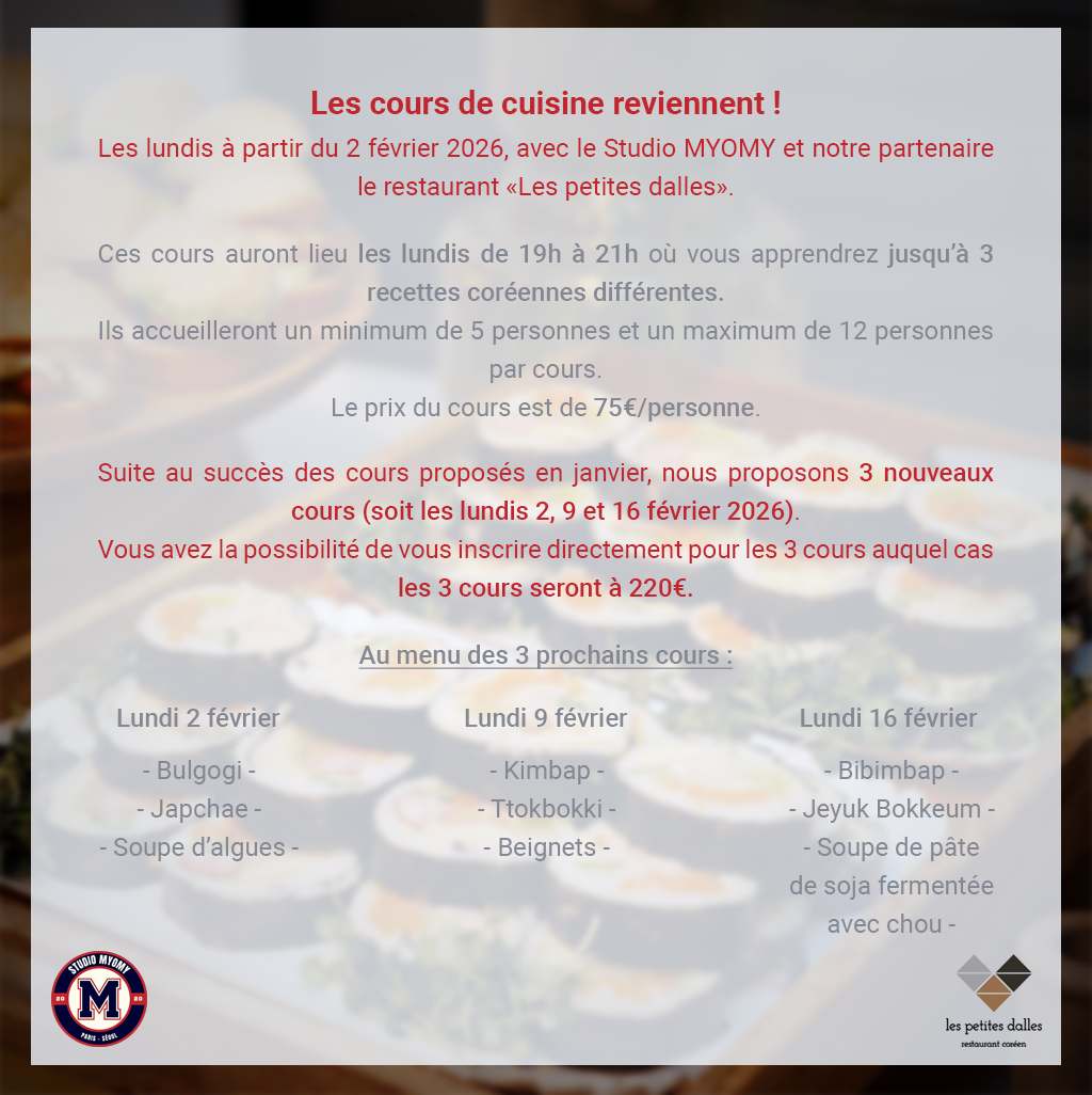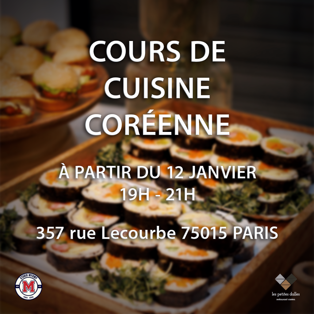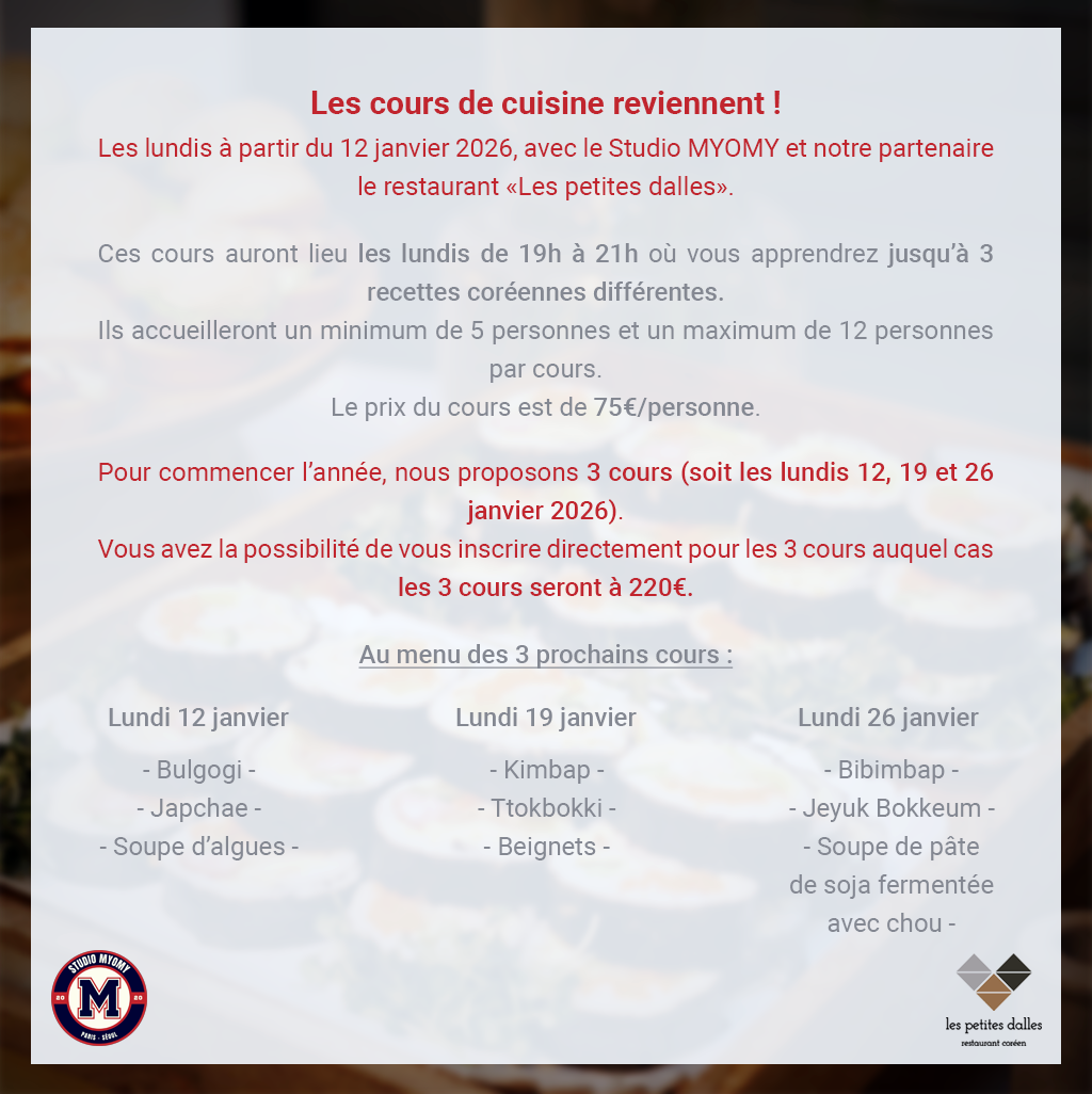 Ces cours auront lieu les lundis de 19h à 21h où vous apprendrez jusqu’à 3 recettes coréennes différentes.